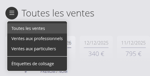 Par exemple depuis la page des ventes, vous pouvez n'afficher que les ventes destinées aux particuliers ou aux professionnels, et imprimer vos étiquettes de colisage.