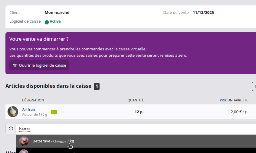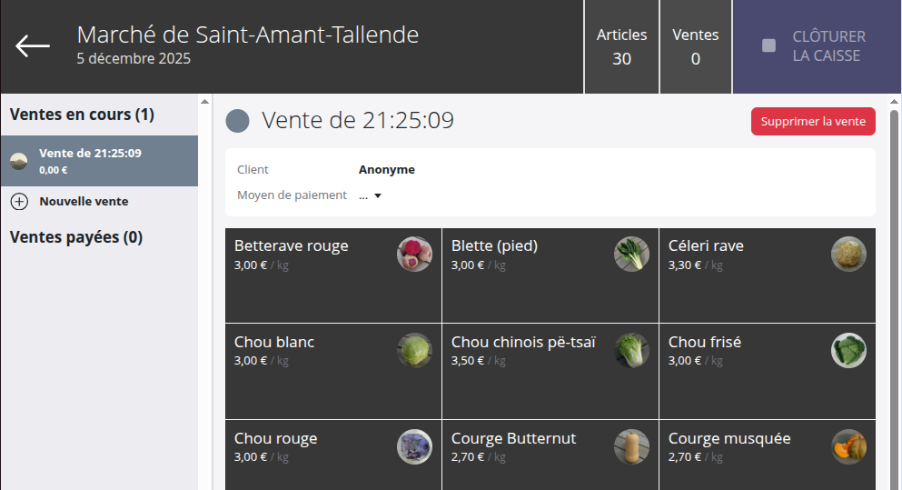 Créer votre premier marché avec le logiciel de caisse va prendre un peu de temps, car vous devrez ajouter manuellement les produits que vous souhaitez vendre dans le logiciel. Pour les marchés suivants, nous vous recommandons d'utiliser la fonctionnalité Dupliquer une vente.
