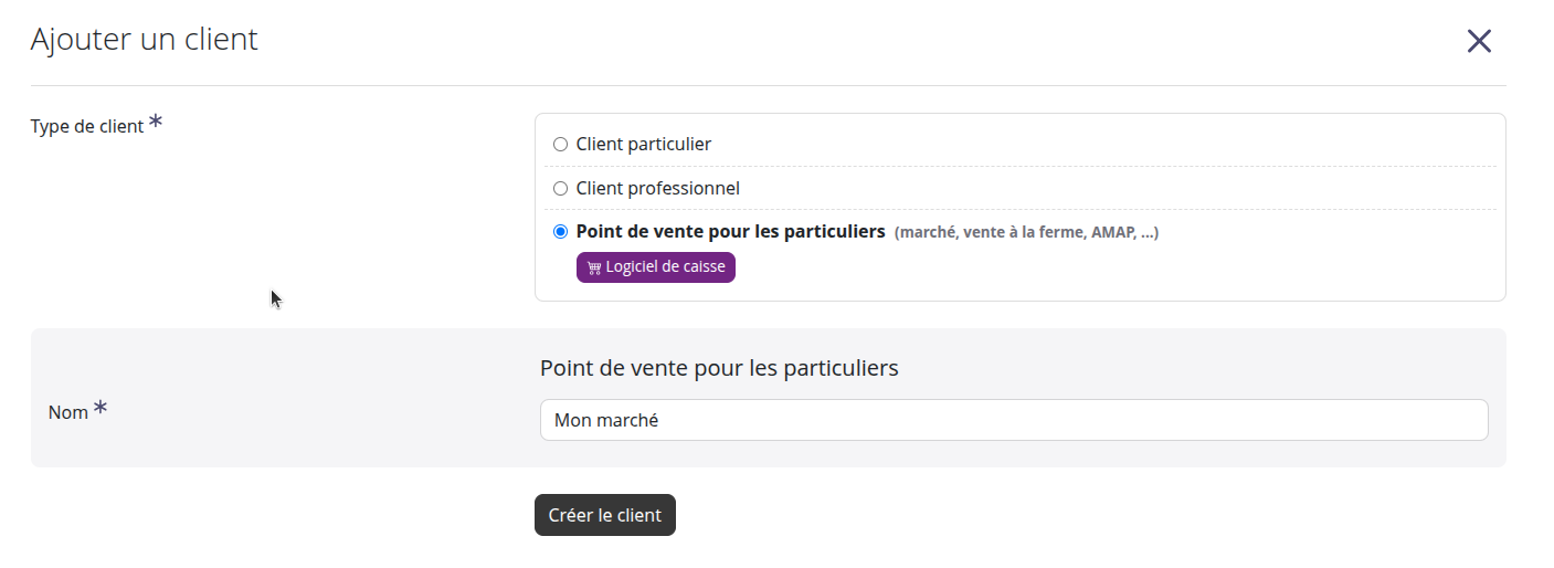 Vous devez créer un client de type Point de vente pour les particuliers en indiquant le nom de votre marché comme nom de client.