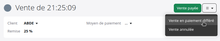 Si vous permettez à certains clients de payer plus tard (par exemple sur facture en fin de mois), vous avez la possibilité de sélectionner l'option Vente en paiement différé à la place de Vente payée. En choisissant cette option, la vente sera sortie du logiciel de caisse et sera intégrée à la page des ventes de votre ferme.