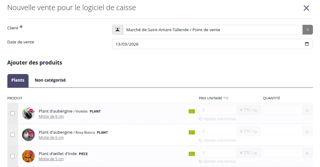 Une fois la vente créée, vous pouvez encore compléter votre gamme. Pour chaque produit, vous pouvez indiquer la quantité que vous souhaitez emporter au marché. Cela peut vous être notamment utile pour préparer vos récoltes ou vos conditionnements.