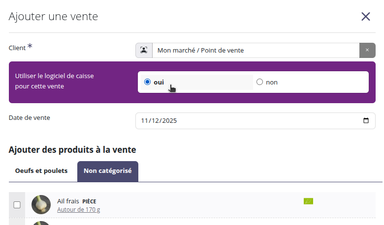 Une fois le client créé, vous pouvez maintenant lui créer une vente en veillant à activer le logiciel de caisse pour cette vente. Vous pouvez en profiter pour sélectionner les produits que vous voulez proposer à la vente. Il n'est pas indispensable de sélectionner les produits à cette étape, vous pourrez également le faire à l'étape suivante.