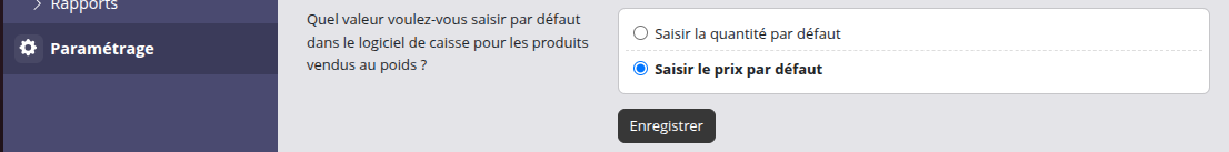 Par défaut, c'est le champ de Prix qui est sélectionné pour les produits vendus au poids. Si cela nous vous convient pas, vous pouvez sélectionner le champ Quantité par défaut dans les réglages de base du module Vendre.